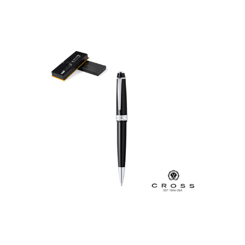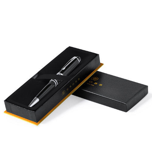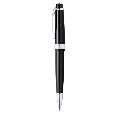 Stylo de Cross modèle Bailey Light, combinant une résine brillante avec des finitions métalliques en chrome poli. Cartouche jumbo et encre noire. Présenté dans un élégant étui noir individuel avec le logo de la marque et une doublure en doux suédine assortie.