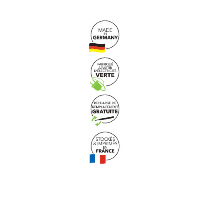 Le corps du stylo est injecté en bioplastique. Corps et pointe: injectés à partir de matériaux renouvelables à base de canne à sucre, certifié sans OGM, surface mate, partie supérieure et clip transparents.