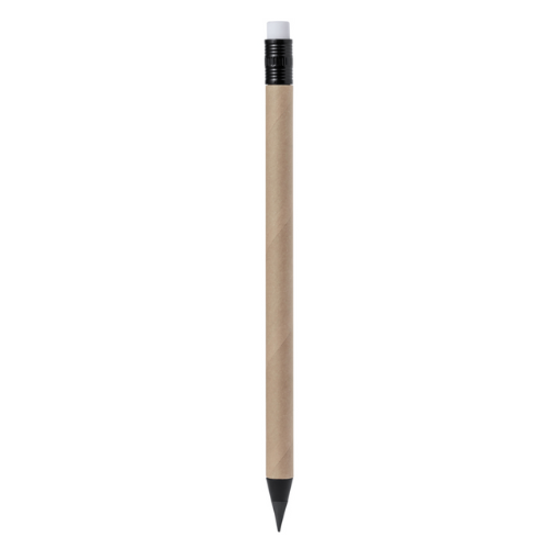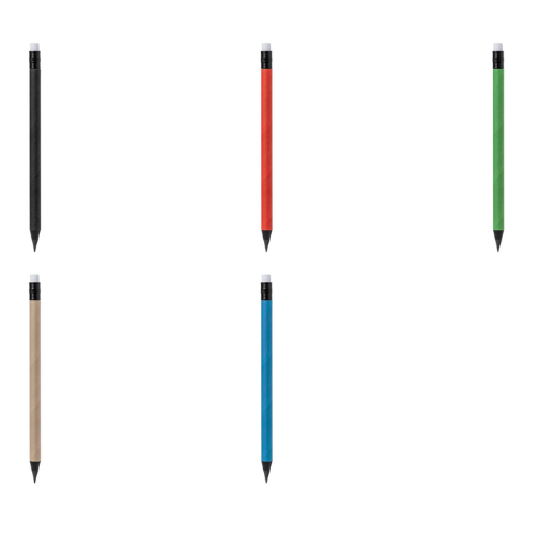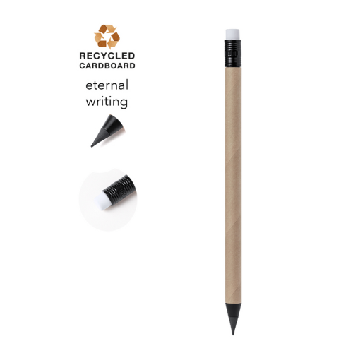 Crayon éternel fabriqué en carton recyclé. Réutilisable et écrit à l’infini, pour toujours utiliser le même crayon et ne pas générer de déchets. Comprend gomme sur le dessus du crayon, avec un logo en carton recyclé à une extrémité de la canne. Disponible dans une large gamme de couleurs.