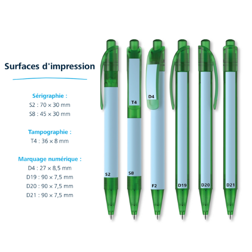 Stylo à bille rétractable en plastique transparent ou opaque. Corps composé de >90 % (modèle opaque) ou 73 % (modèle transparent) de plastique recyclé.