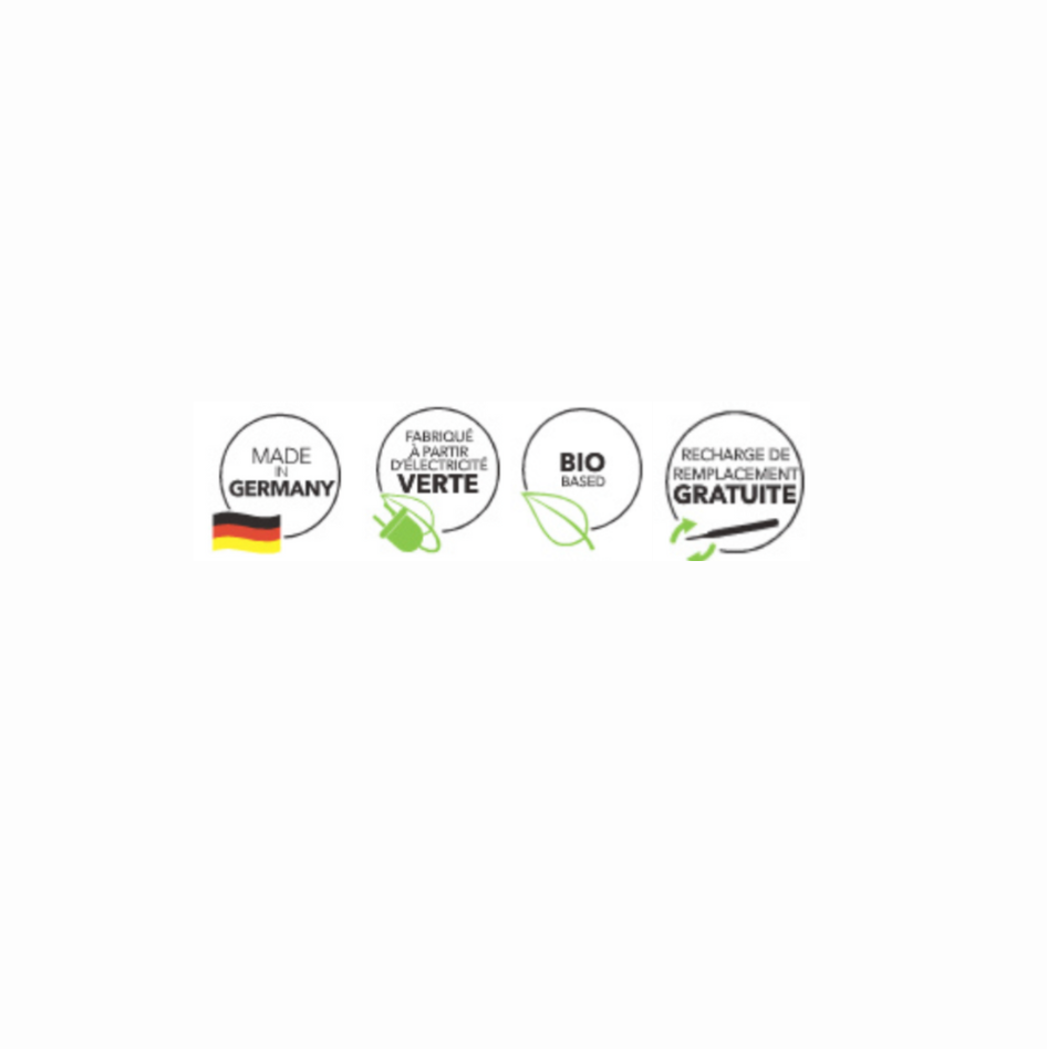 Le corps du stylo est injecté en bioplastique. Corps et pointe: injectés à partir de matériaux renouvelables à base de canne à sucre, certifié sans OGM, surface mate, partie supérieure et clip transparents.