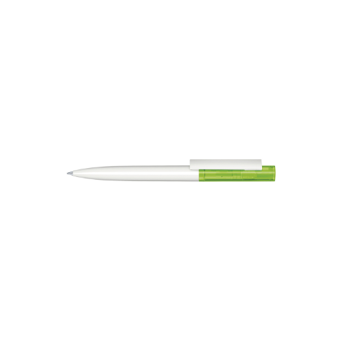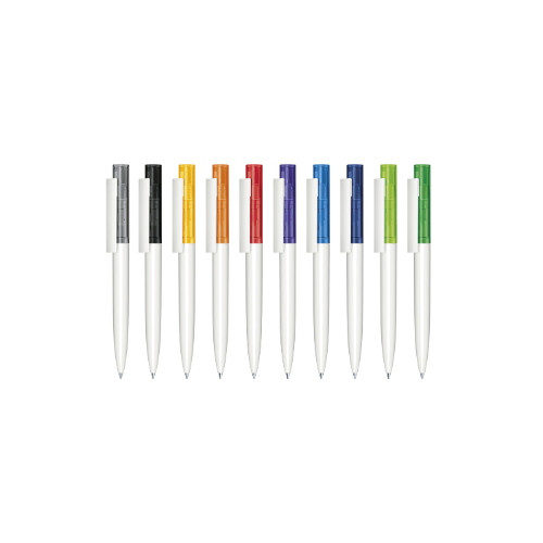 Le corps du stylo est injecté en bioplastique. Corps et pointe: injectés à partir de matériaux renouvelables à base de canne à sucre, certifié sans OGM, surface mate, partie supérieure et clip transparents.