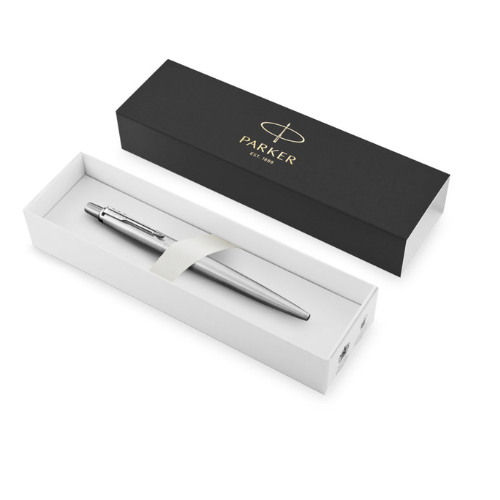 Un classique parmi les stylos à encre gel. Fabriqué en acier inoxydable, avec des garnitures chromées et le clip avec la forme de pointe de flèche emblématique de la marque. Avec mécanisme à bouton-poussoir, cartouche intérieure Parker classique et encre bleue. Présentation en boîte noire individuelle avec logo Parker.