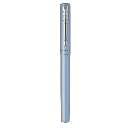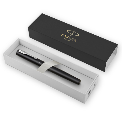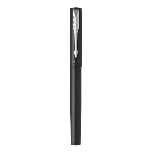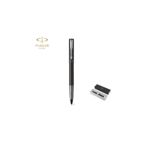 Stylo roller Parker Vector XL, en acier inoxydable poli, souligné d'une garniture chromée et de l'incomparable clip avec la forme de pointe de flèche emblématique de la marque sur le capot. À l'encre noire et présenté dans une boîte individuelle noire avec le logo Parker.