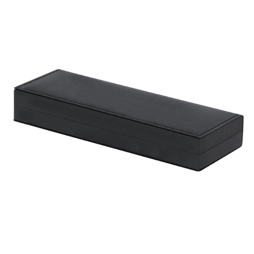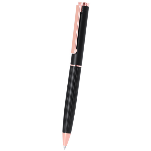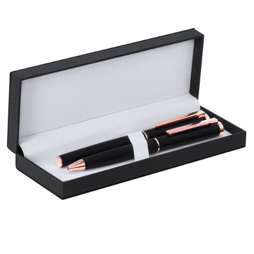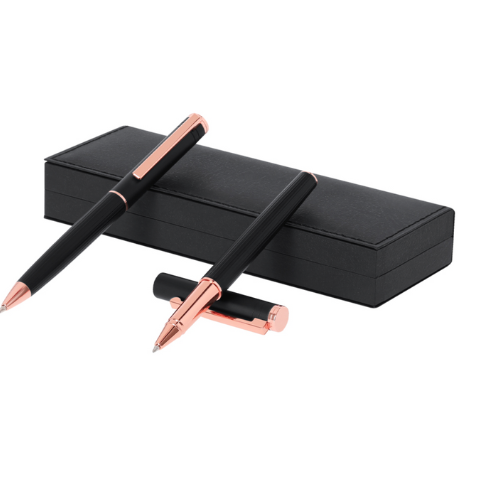 Ensemble stylo-bille et stylo roller distinctif, tous deux conçus avec des corps en aluminium noir mat élégant et des éléments décoratifs en or rose. Corps texturé pour une prise en main facile et clip en métal. Stylo-bille avec mécanisme rotatif et stylo roller avec capuchon, tous deux à encre bleue et avec une cartouche jumbo. Présenté dans un étui sophistiqué noir aspect cuir, intérieur blanc. Stylo et Roller. Recharge Jumbo. Aluminium.