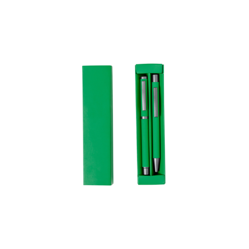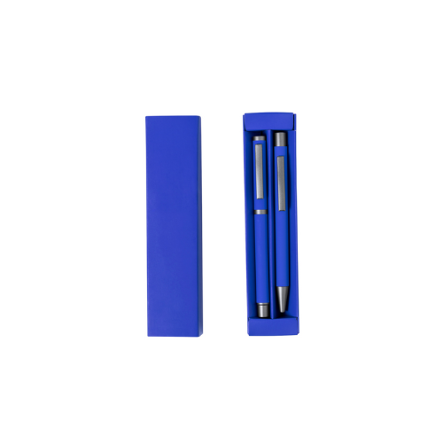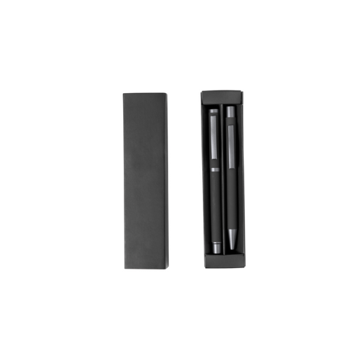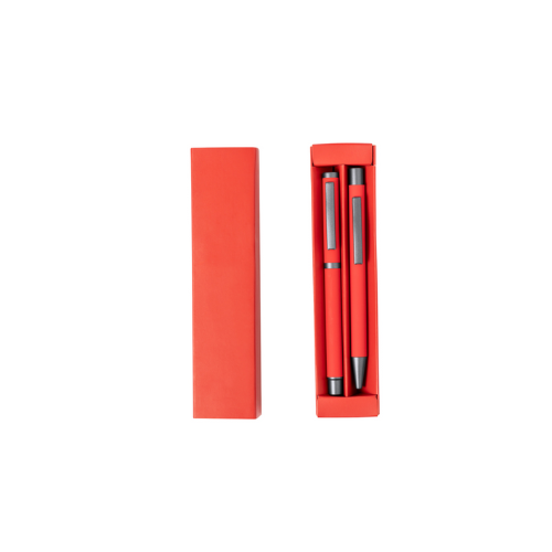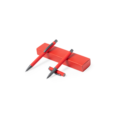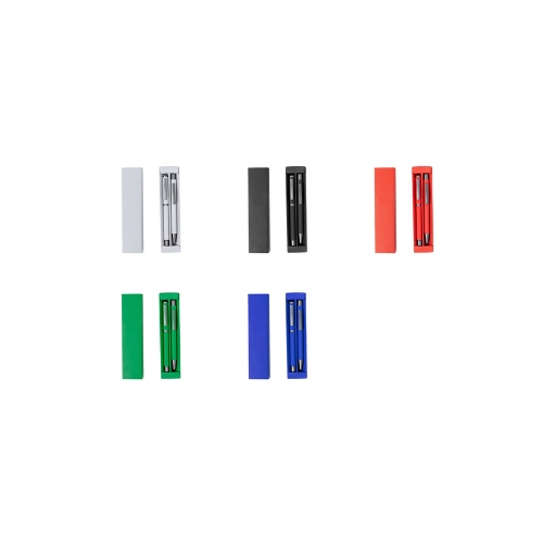 Élégant set de stylos et roller. Stylo à bille à bouton-poussoir et à bille avec capuche, tous deux avec clip métallique, chargement jumbo et encre bleue. Corps en différentes couleurs solides finition gomme et détails métalliques gris foncé. Présentés dans une boîte de couleurs assorties avec compartiments intérieurs séparés. Stylo et Roller. Aluminium.