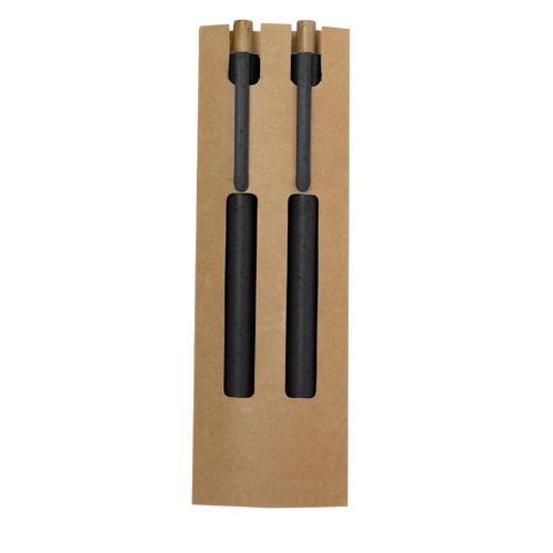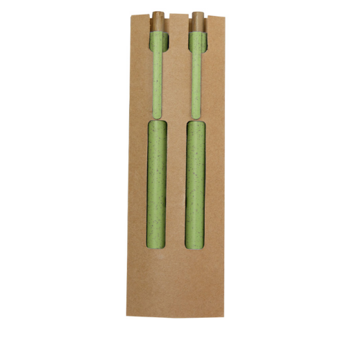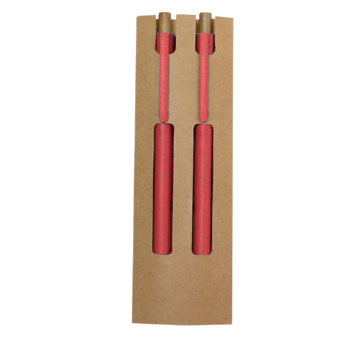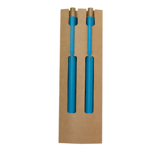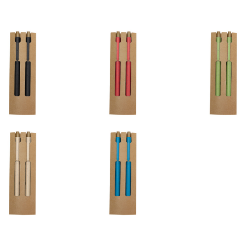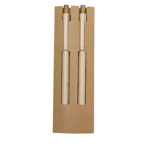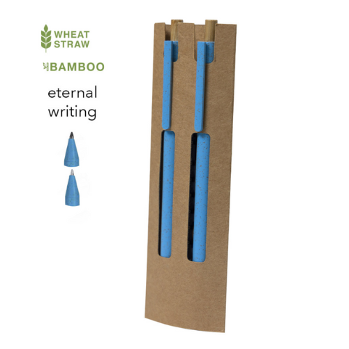 Set de stylo et crayon éternel fabriqués en paille de blé et bambou. Stylo avec mécanisme à bouton fabriqué en bambou avec encre bleue et clip assorti. Et crayon avec mécanisme à bouton fabriqué en bambou avec pointe éternelle, afin d'utiliser toujours le même crayon et de ne pas générer de déchets. Présentés dans un étui en carton recyclé. Avec marque de paille de blé imprimée.
