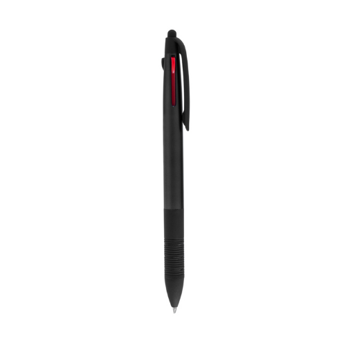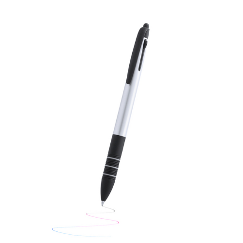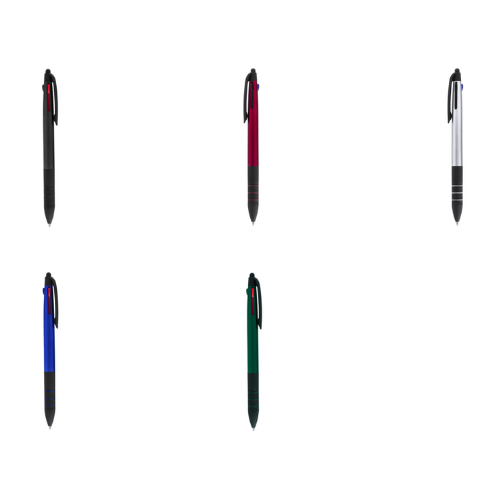 Stylo stylet 3 en 1 avec mécanisme à bouton poussoir rétractable. Ligne actuelle avec corps finition métallisé dans des couleurs vives. Attributs noirs et grip ergonomique noir avec anneaux assortis. 3 cartouches d´encre : bleue, rouge et noire.
