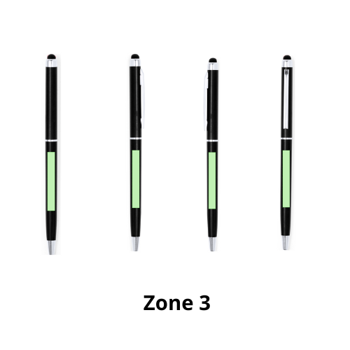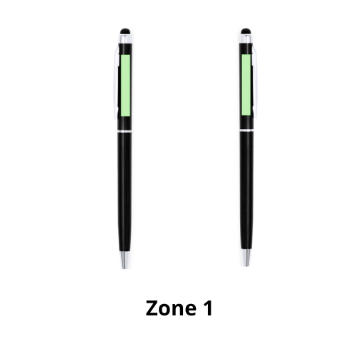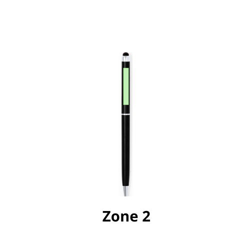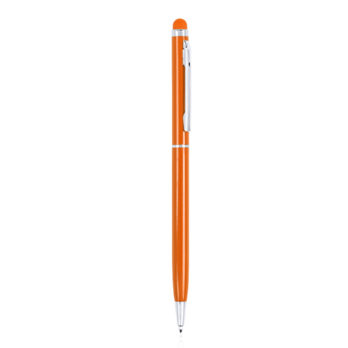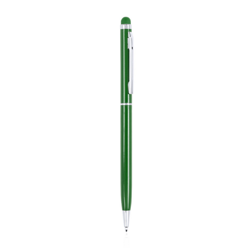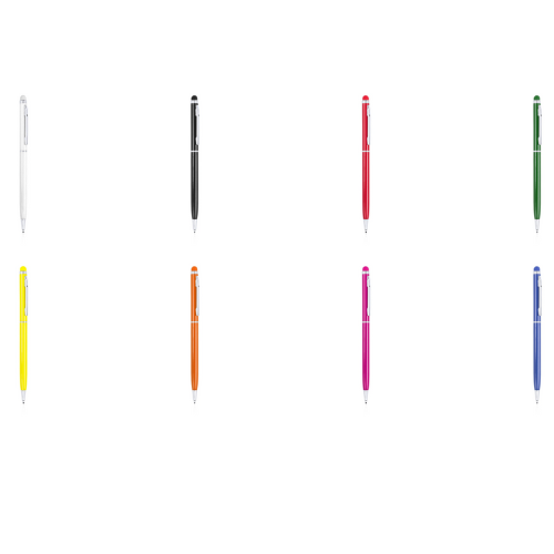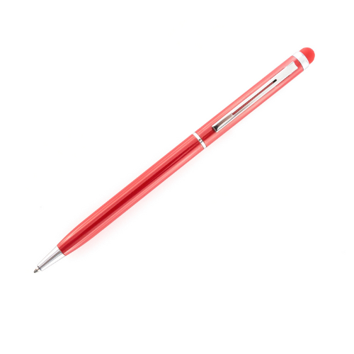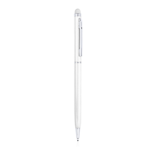 Stylo stylet à mécanisme rotatif, corps ultra-mince en aluminium finition métallisée et embout tactile assorti. Coloris variés. Attributs et bagues coloris argent. Encre bleue.