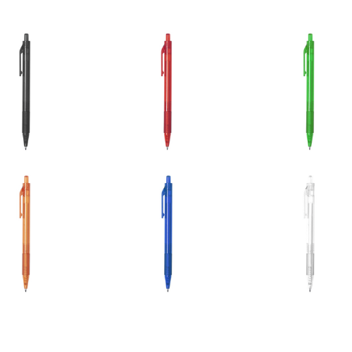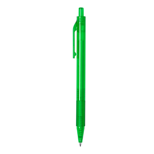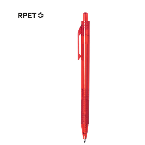 Stylo à bille à bouton-poussoir fabriqué en RPET. Corps lisse et fini en différentes couleurs transparentes et poignée assortie. RPET Logo sur le dessus du stylo. Encre bleue.