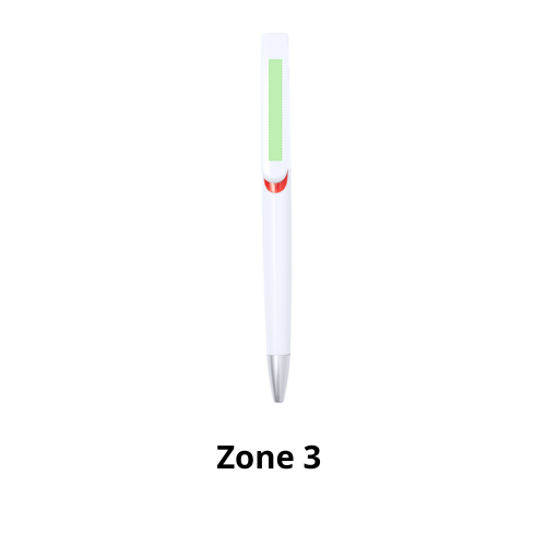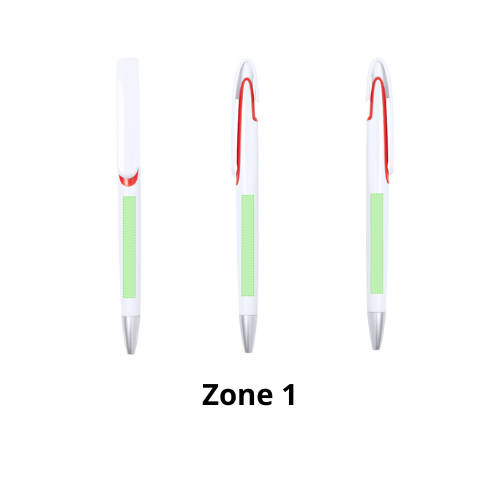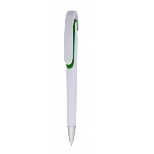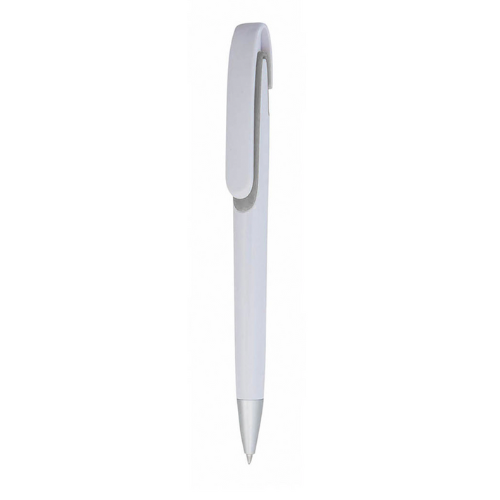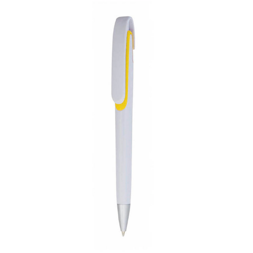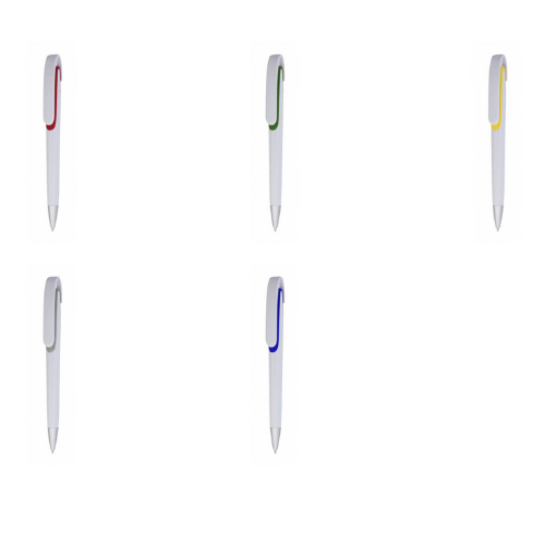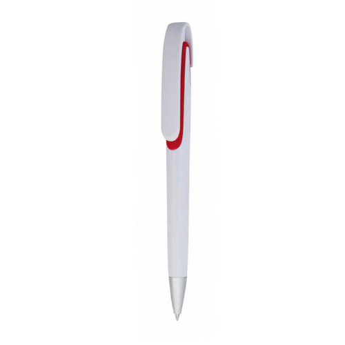 Stylo avec mécanisme à bouton-poussoir au design audacieux tricolore avec attributs en couleurs vives et corps blanc uni. Clip original incurvé assorti et prise en main confortable. Encre bleue
