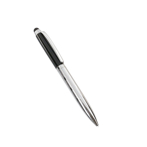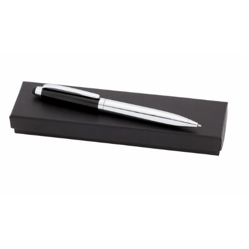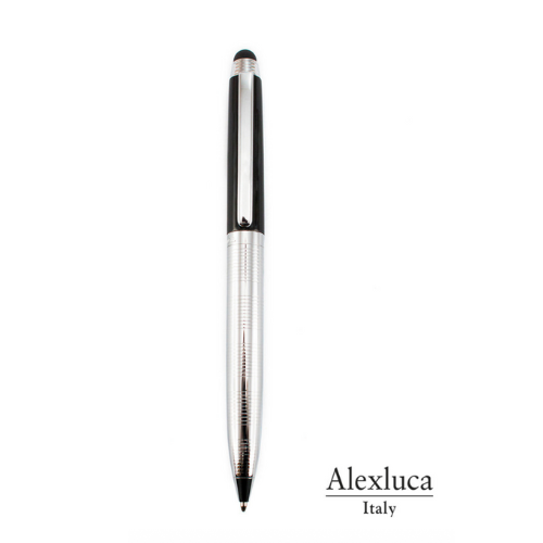 Stylo pointeur Alexluca avec mécanisme pivotant et corps métallique lisse, dans une élégante combinaison de couleurs argent et noir. Clip et poignée design assorti. Présenté dans un étui noir individuel avec le logo de la marque. De l´encre bleue. Métal.