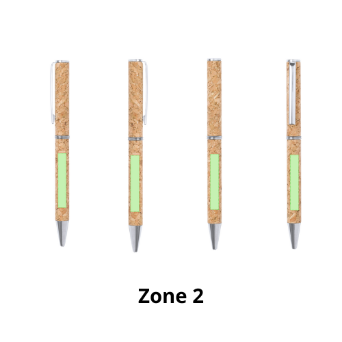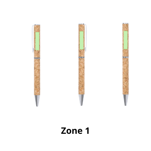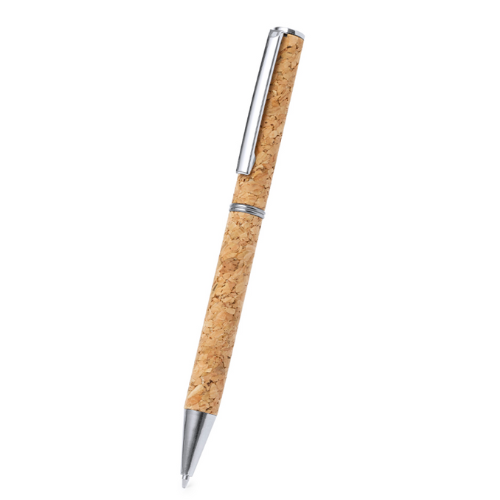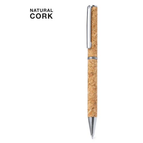 Stylo avec corps en liège naturel. Clip métallique et accessoires chromés. Mécanisme rotatif et encre bleue.