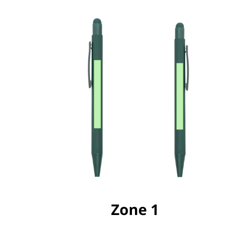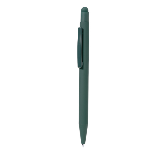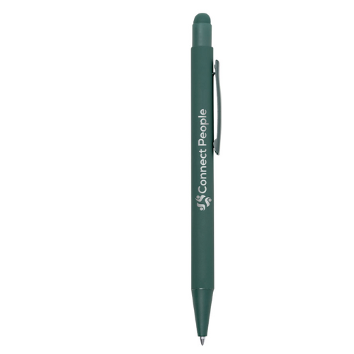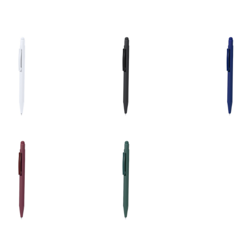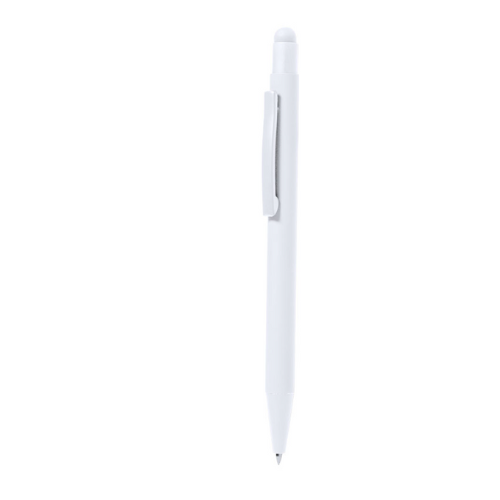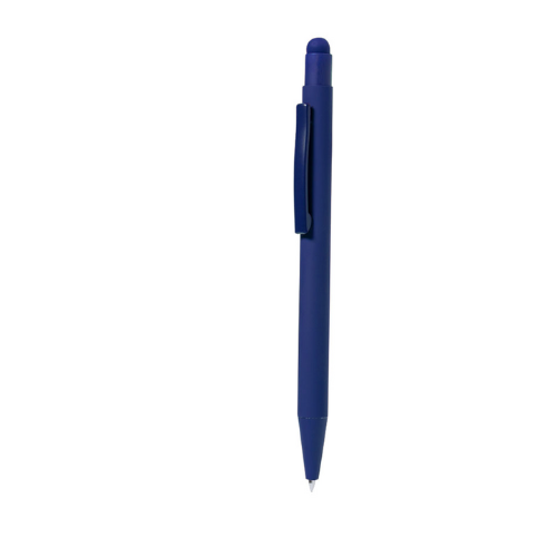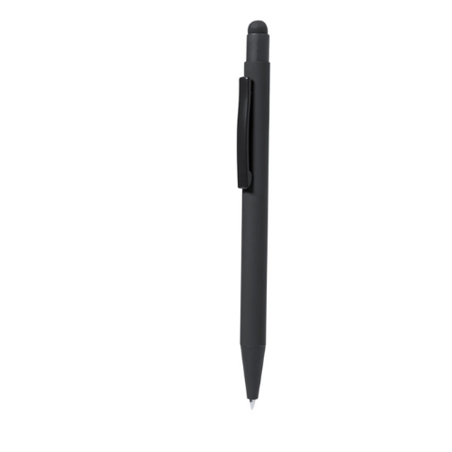Stylo à bille fabriqué en aluminium. Mécanisme à bouton avec pointeur et clip en métal assorti au corps. Corps terminé en caoutchouc, spécialement conçu pour le marquage au laser. Recharge jumbo avec encre bleue.