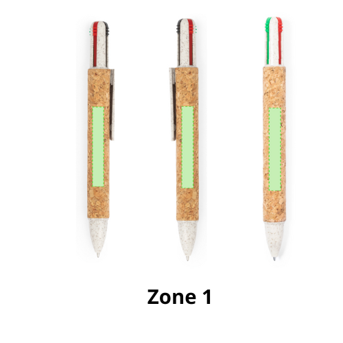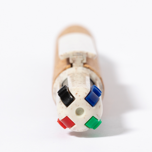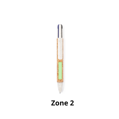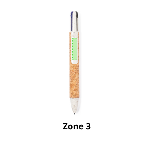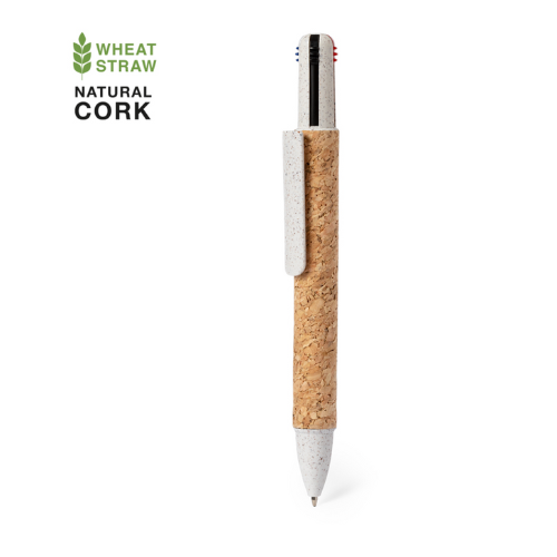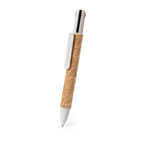 Stylo à bille 4 en 1 avec mécanisme à bouton-poussoir rétractable. Combinaison d'un corps en liège naturel et d'accessoires en canne de blé et ABS, pour favoriser l'utilisation et le recyclage des matières premières, réduisant ainsi les émissions polluantes. 4 cartouches d'encre bleue, rouge, noire et verte.