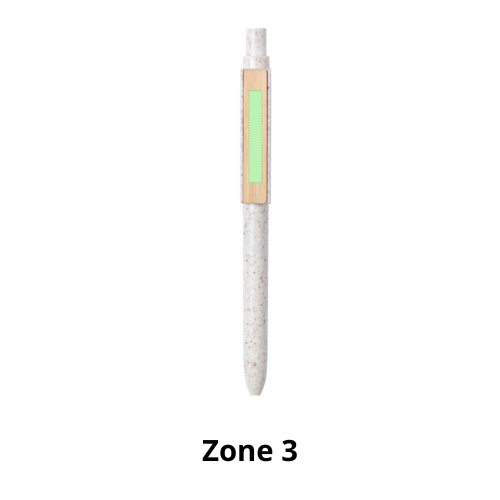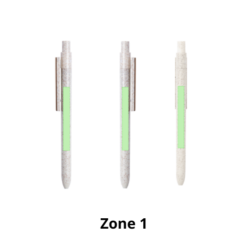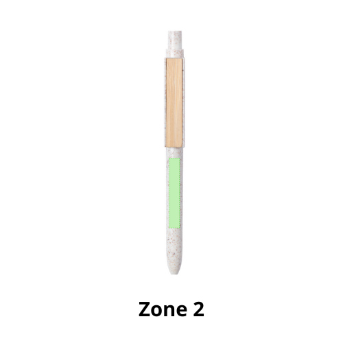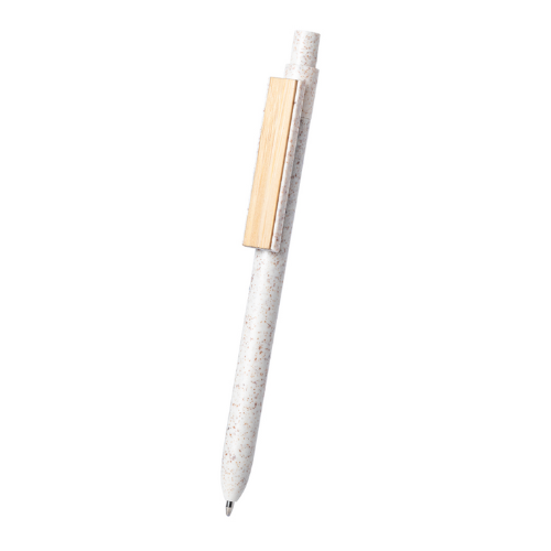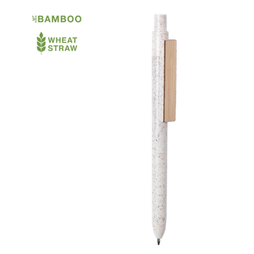 Stylo à bille de la Ligne Nature avec mécanisme à bouton-poussoir. Baril en canne de blé et clip en bambou, favorisant l'utilisation de matières premières naturelles et réduisant les émissions polluantes. Clip avec large zone de marquage et recharge d'encre bleue. Logo en paille de blé sur la partie supérieure du stylo.