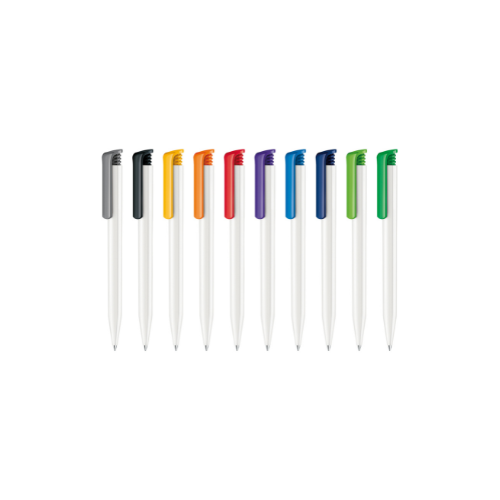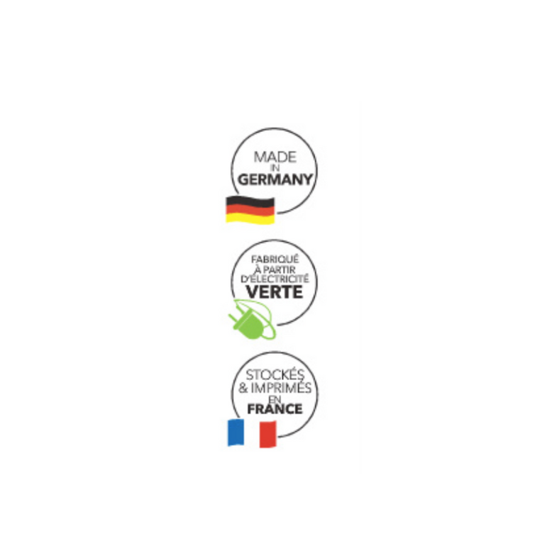 Le corps du stylo est injecté en bioplastique. Corps et pointe: injectés à partir de matériaux renouvelables à base de canne à sucre, certifié sans OGM, surface mate, partie supérieure et clip transparents.