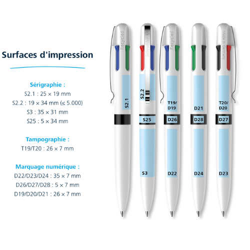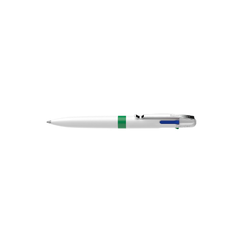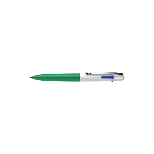 Stylo à quatre couleurs, couleurs d’ encre : noir, rouge, bleu et vert. Corps composé de 92% plastique recyclé.
